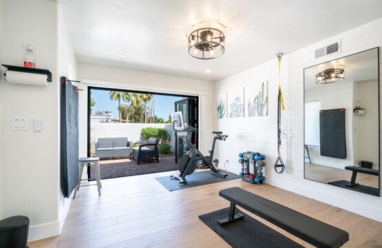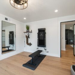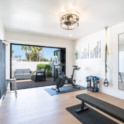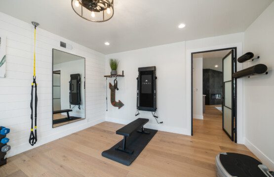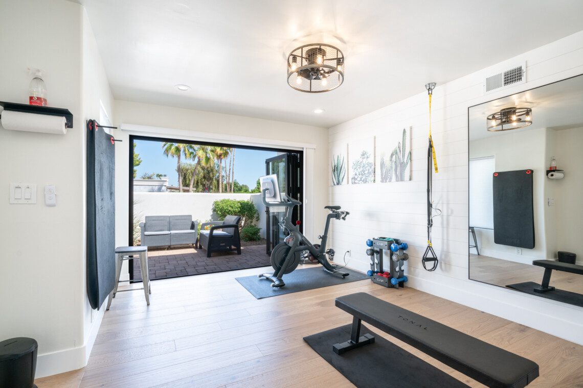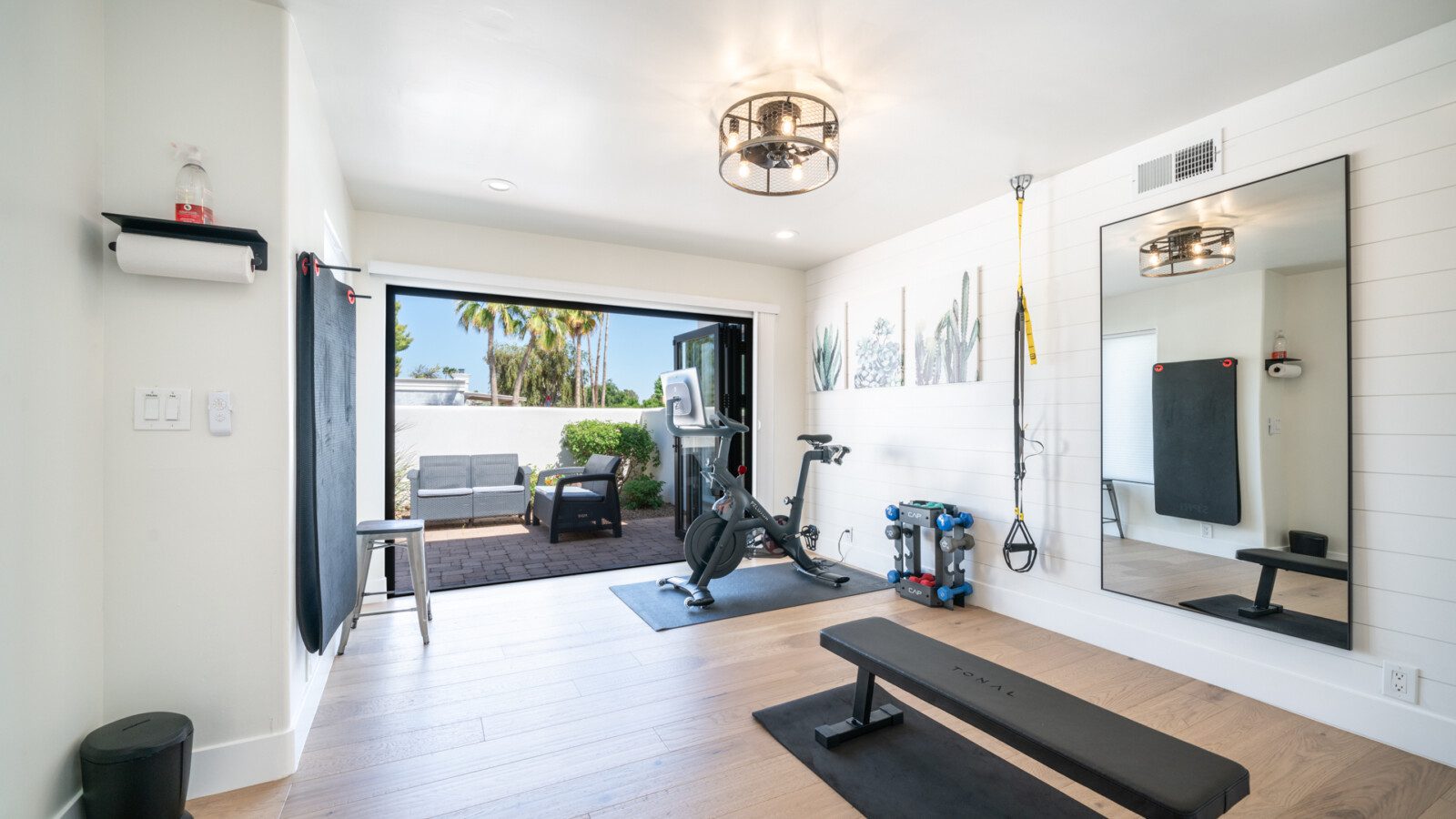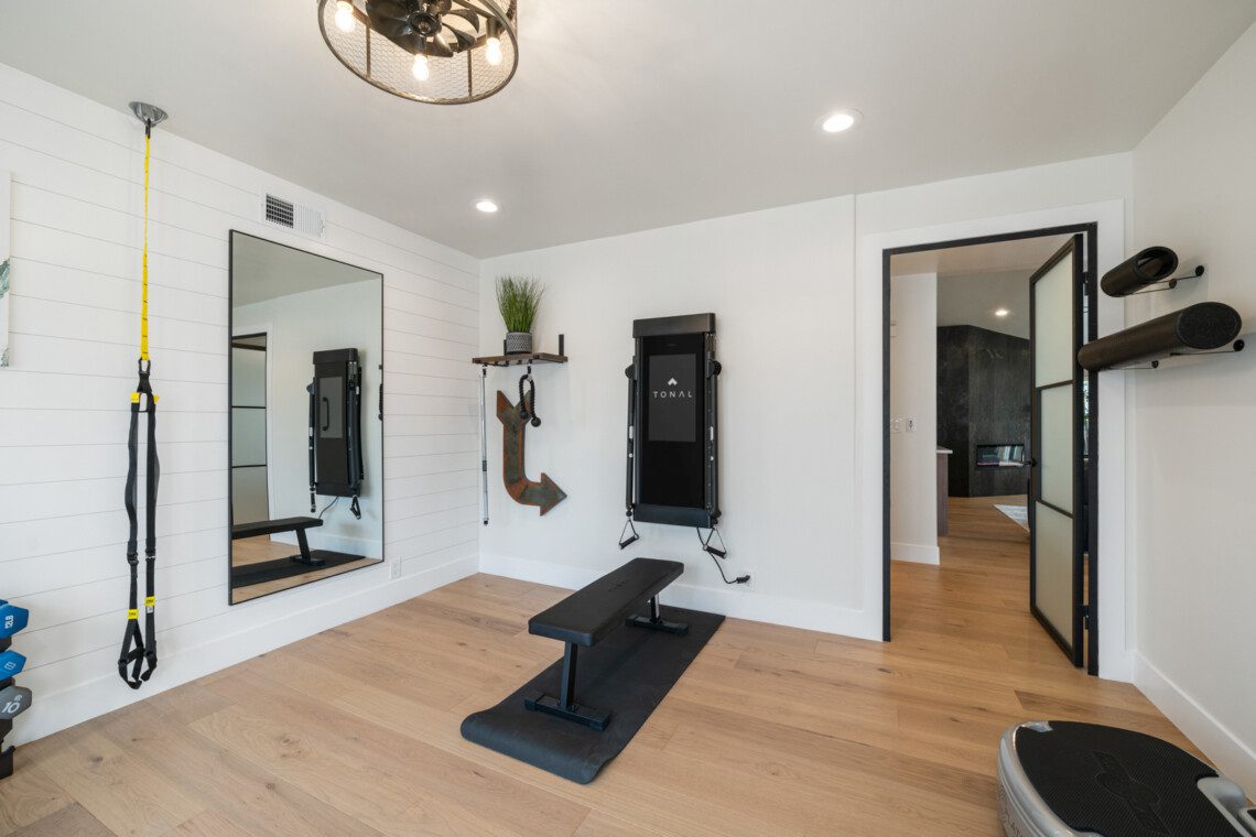 The amazing gym includes: Peloton Bike, Tonal Smart Gym (all in one fitness & strength training), Power Plate-Vibration Plate, TRX, hand weights, and stretching/yoga mats.