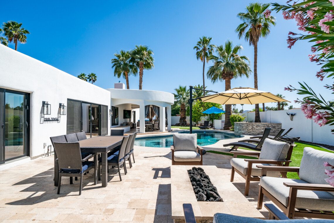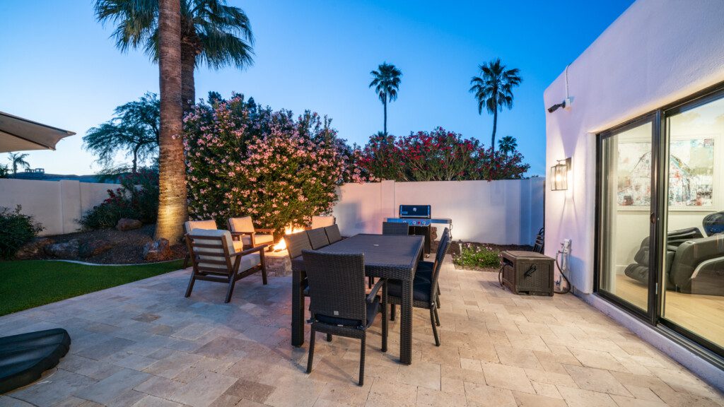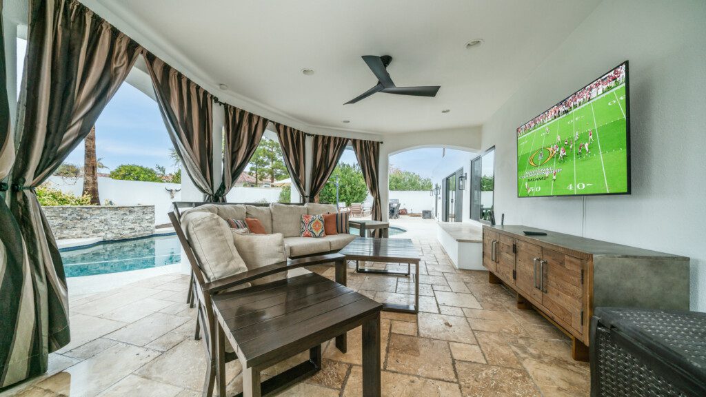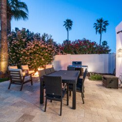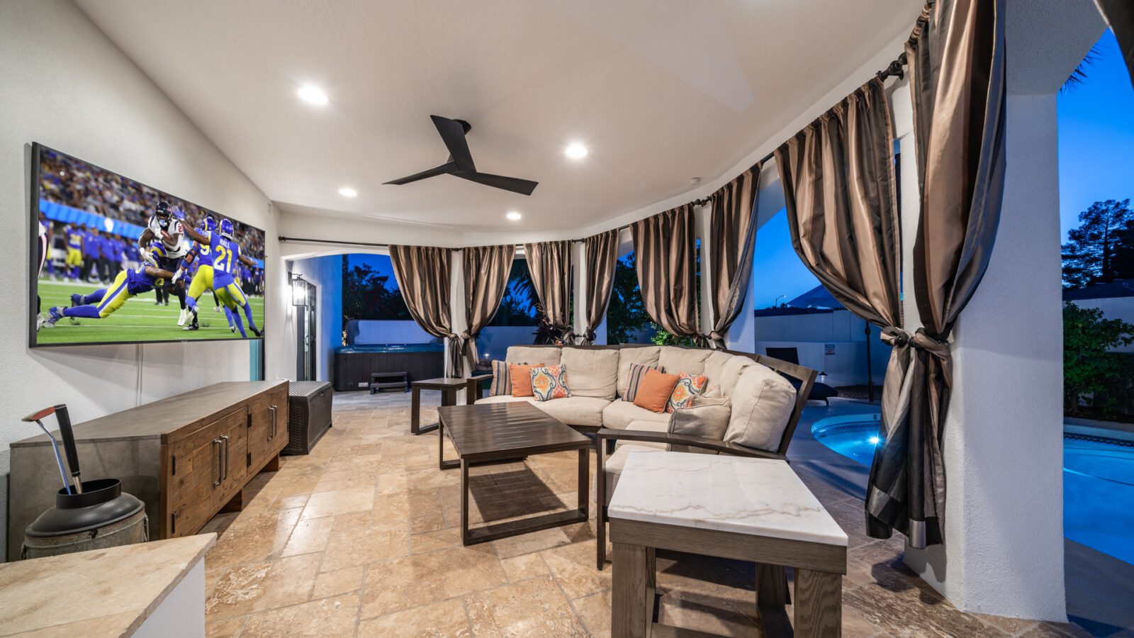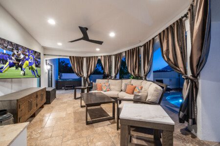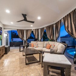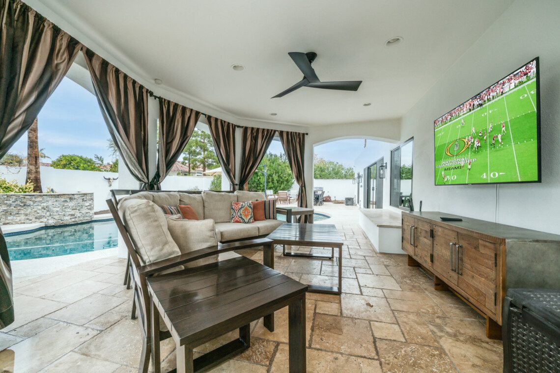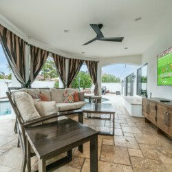 The private backyard is beautifully landscaped with mature palm trees and citrus trees. There is a large covered patio with sectional seating, a 65-inch flat-screen TV, and a large outdoor dining table. The outdoor patio is composed of imported travertine tile.