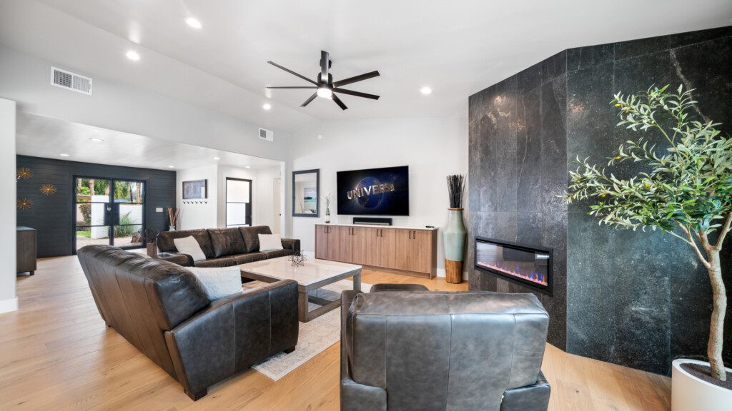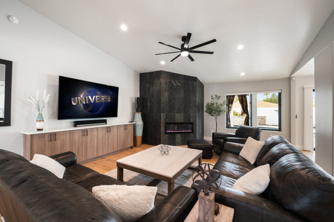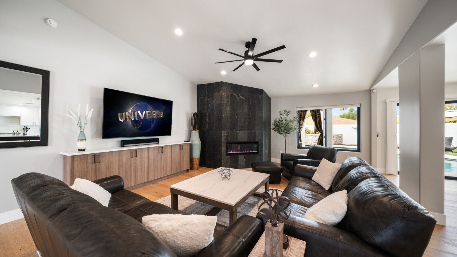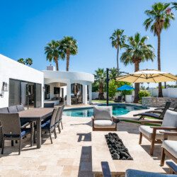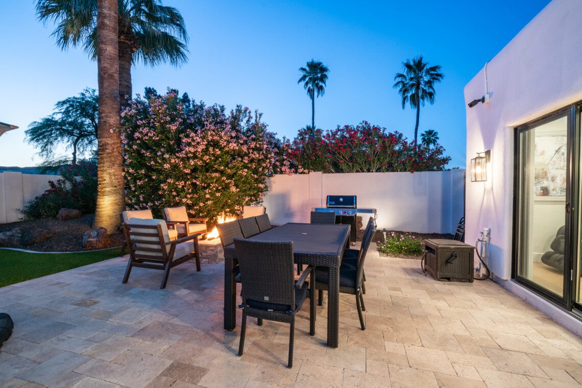 The private backyard is beautifully landscaped with mature palm trees and citrus trees. There is a large covered patio with sectional seating, a 65-inch flat-screen TV, and a large outdoor dining table. The outdoor patio is composed of imported travertine tile.