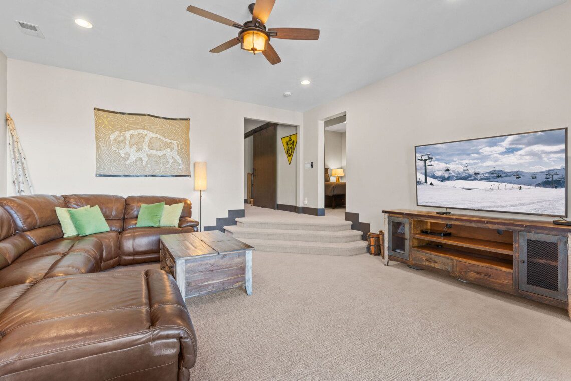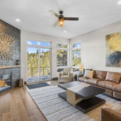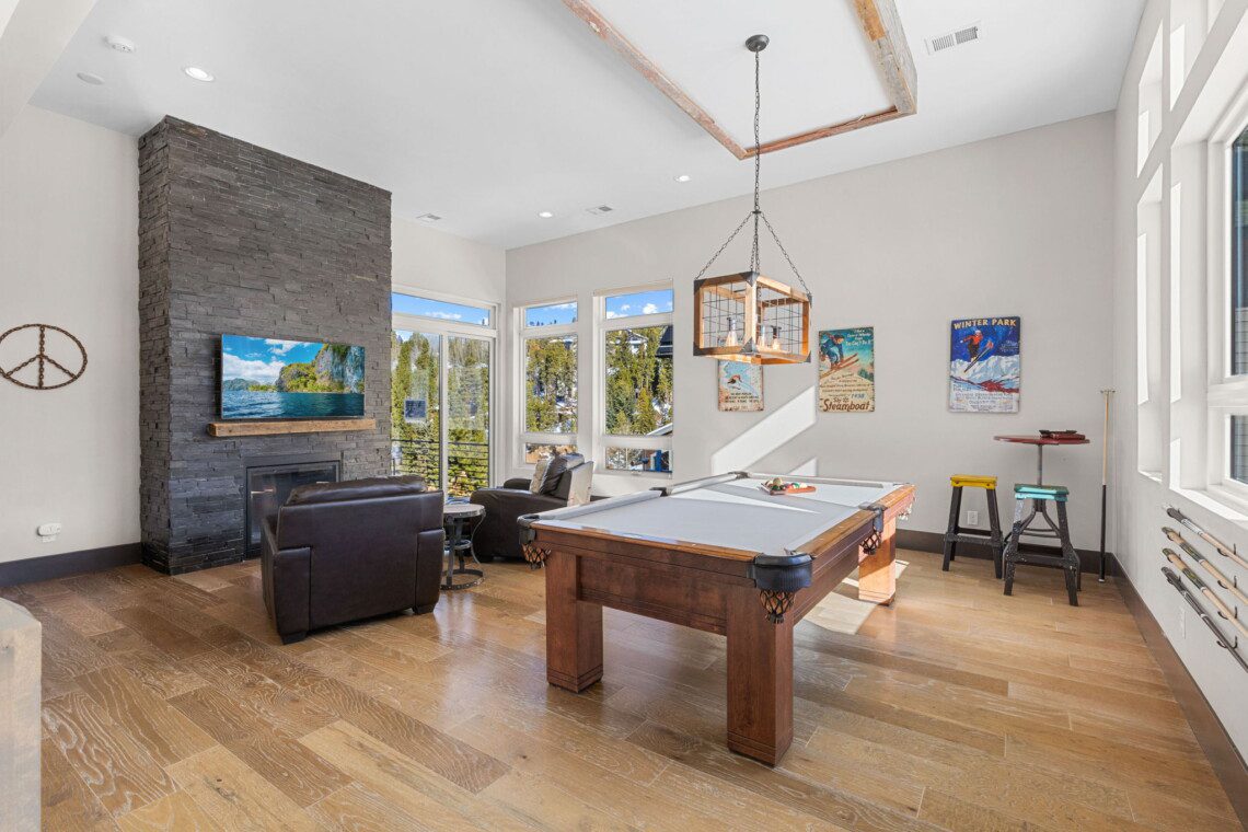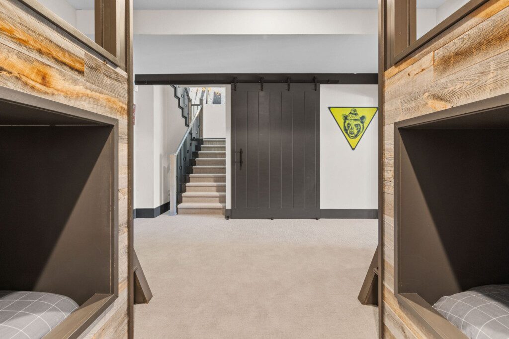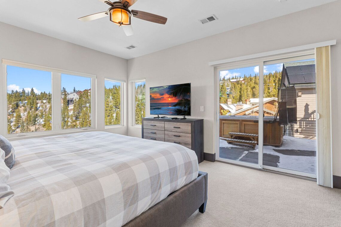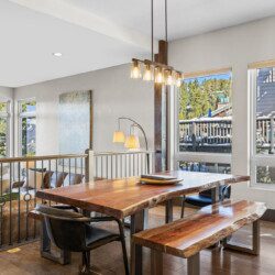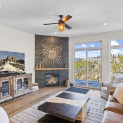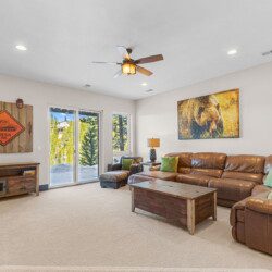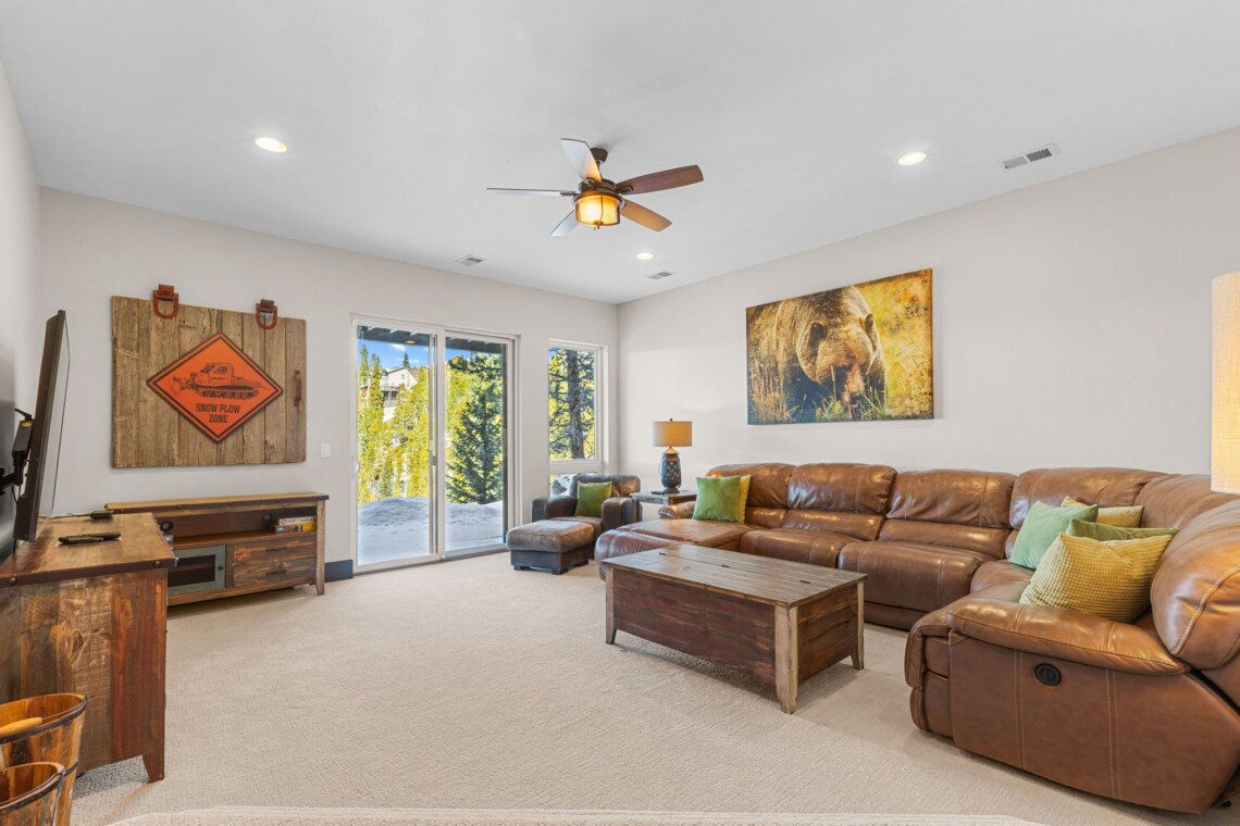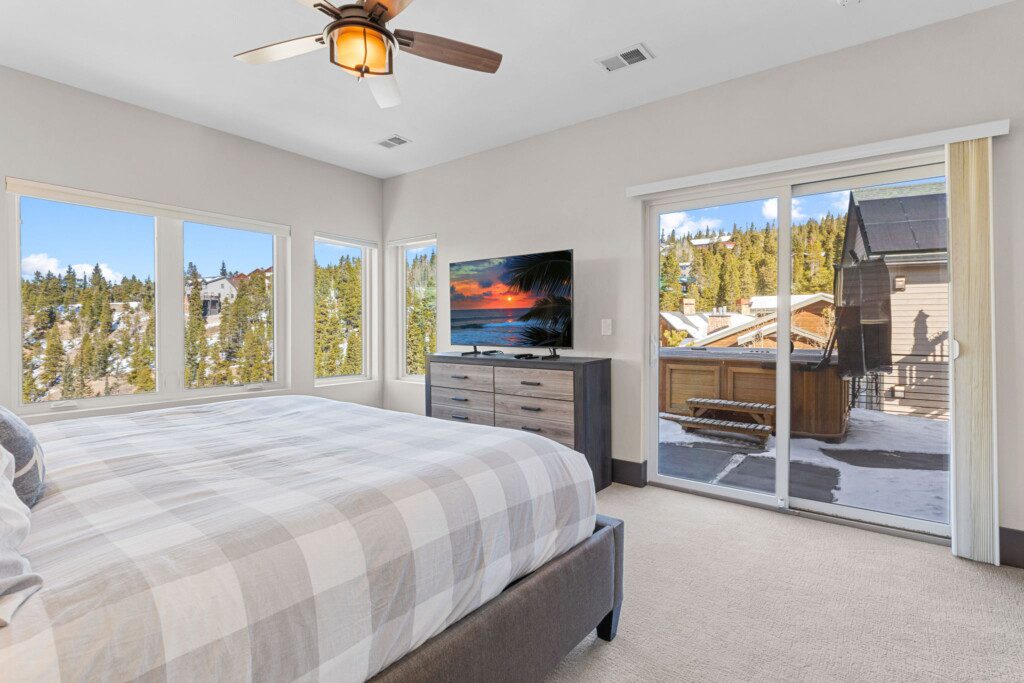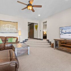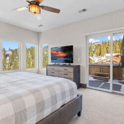 The top and main floors both have a full, private master suite with king beds. The walk-out lower floor has 2 queen bedrooms and an open bunk area that sleeps 6. Every floor has a large common area with massive west-facing windows and decks that look out onto the slopes.