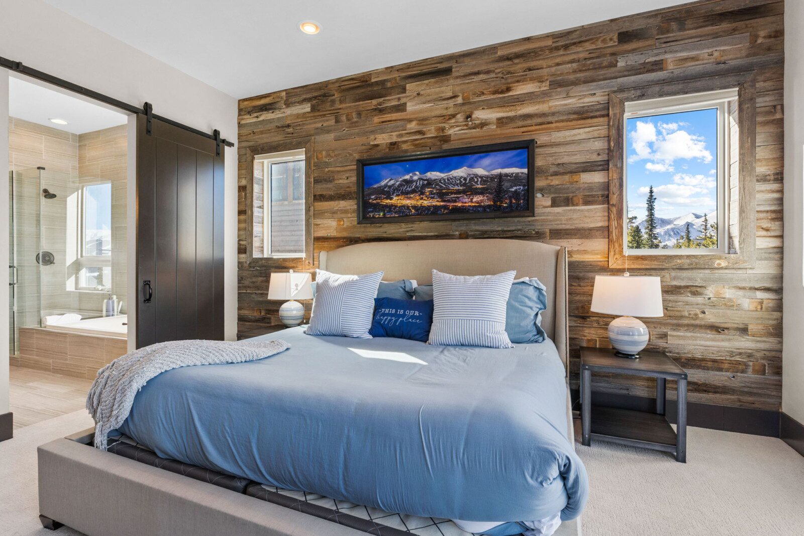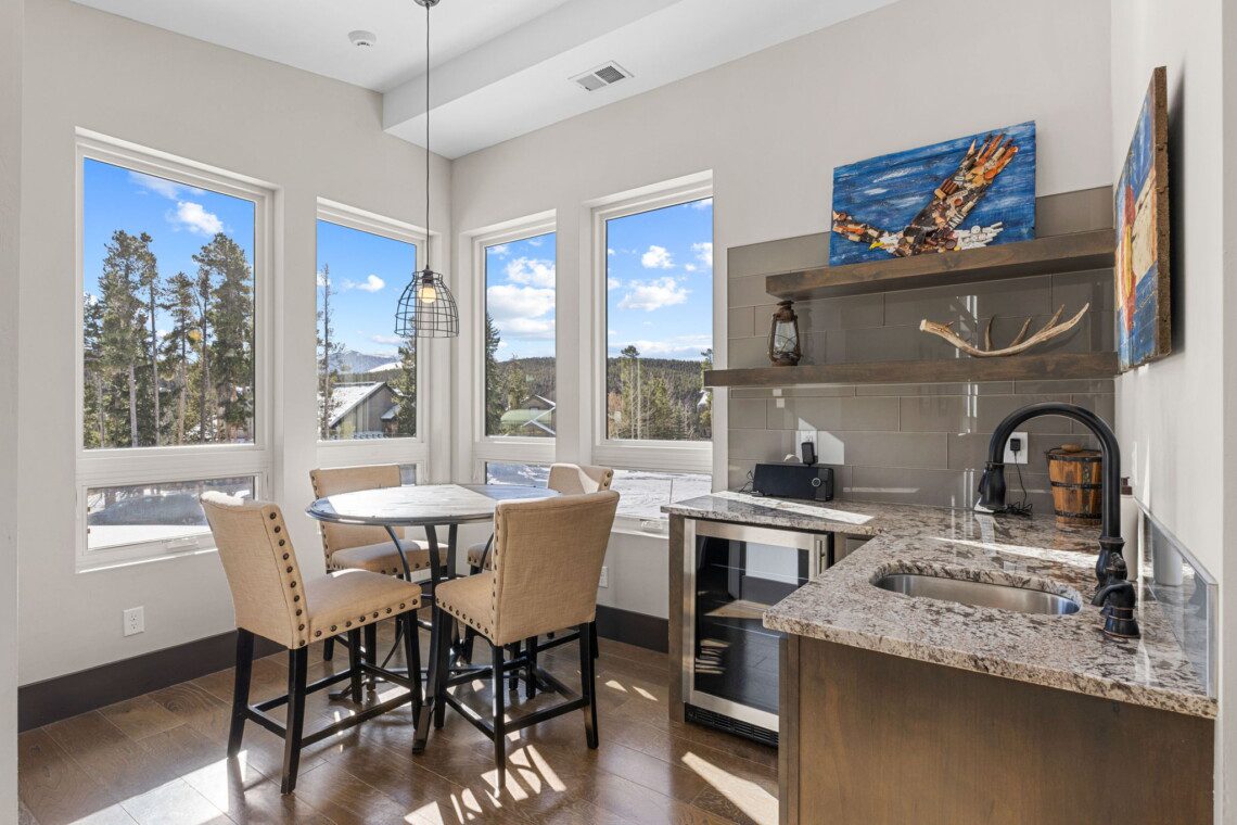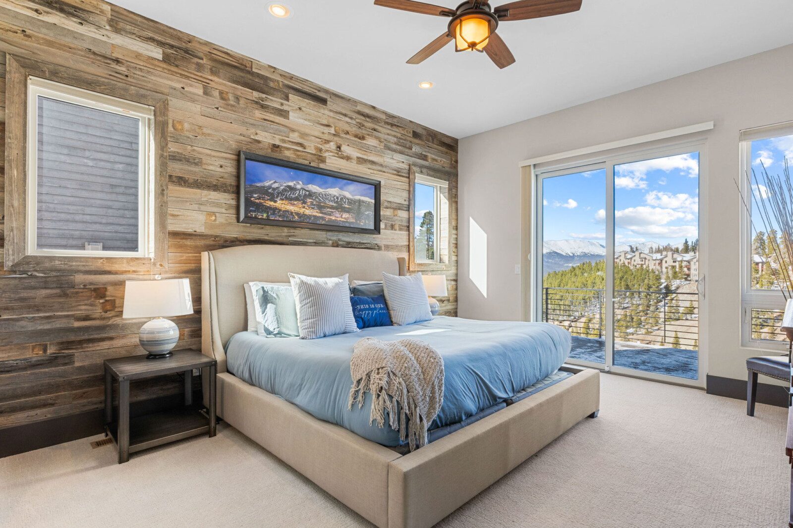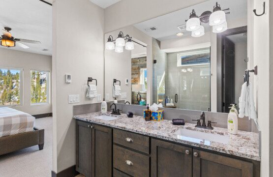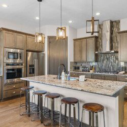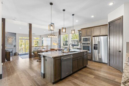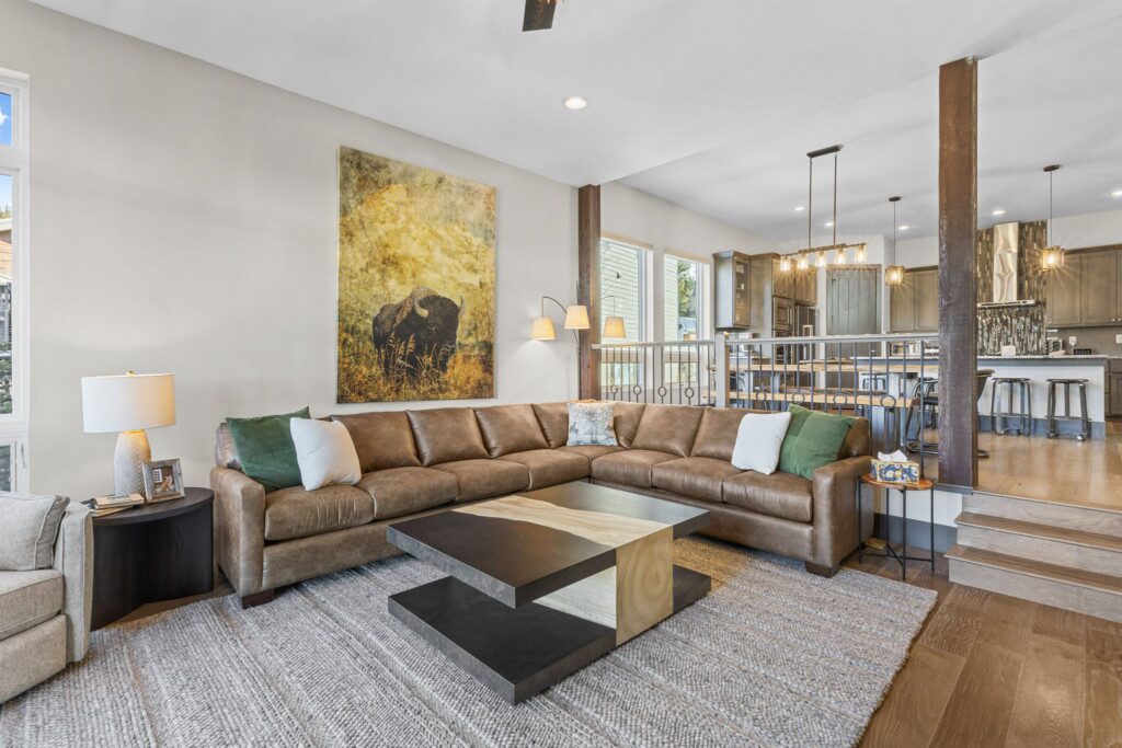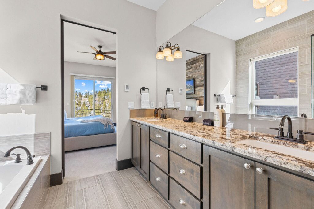 The top and main floors both have a full, private master suite with king beds. The walk-out lower floor has 2 queen bedrooms and an open bunk area that sleeps 6. Every floor has a large common area with massive west-facing windows and decks that look out onto the slopes.
