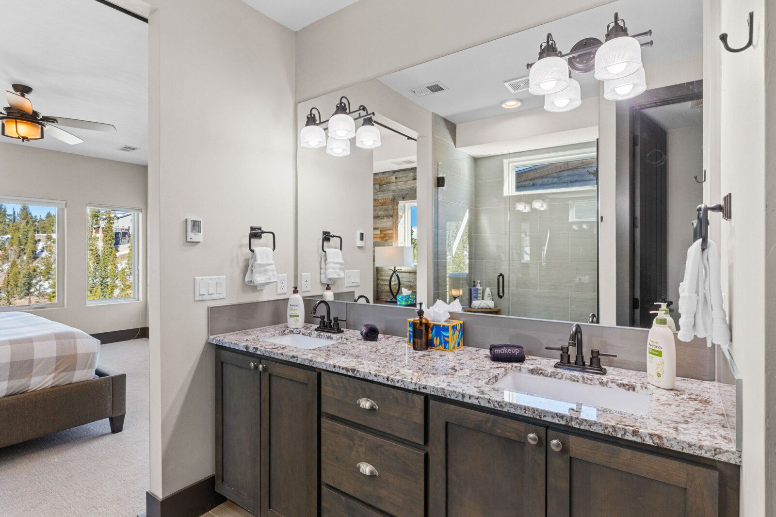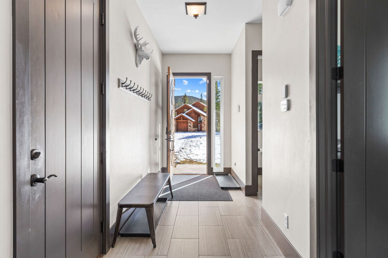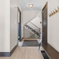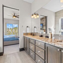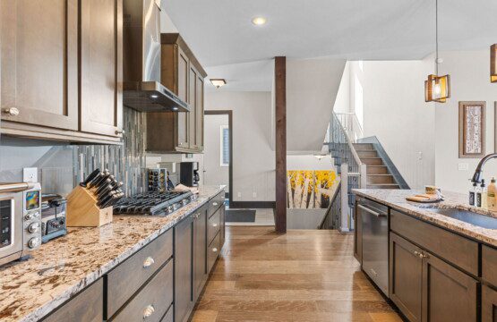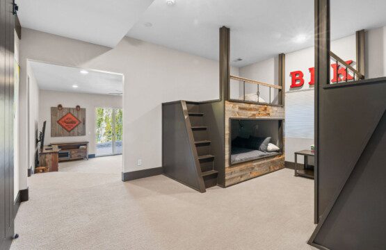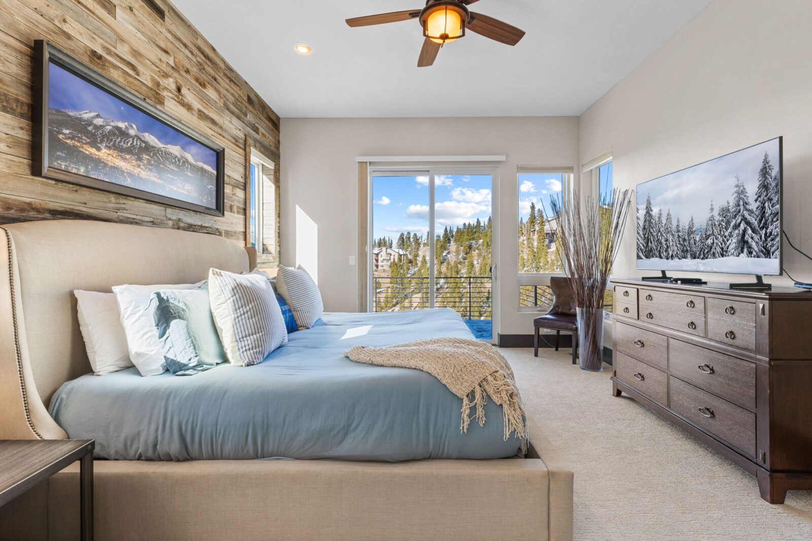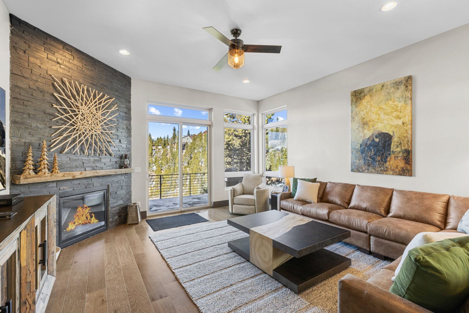 The top and main floors both have a full, private master suite with king beds. The walk-out lower floor has 2 queen bedrooms and an open bunk area that sleeps 6. Every floor has a large common area with massive west-facing windows and decks that look out onto the slopes.