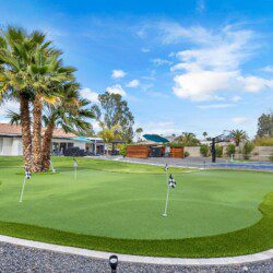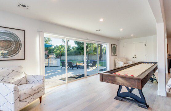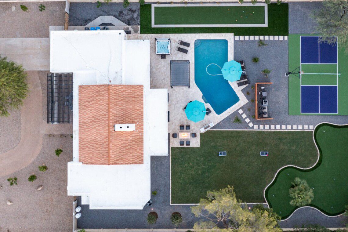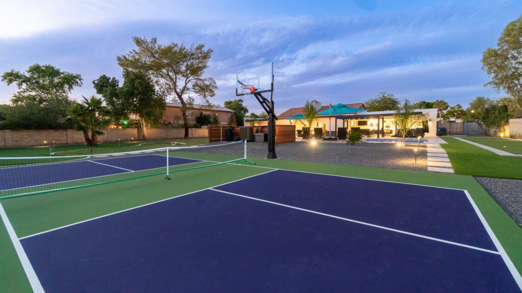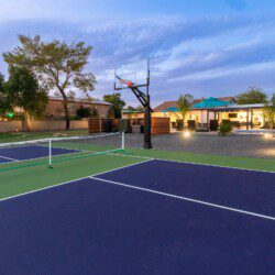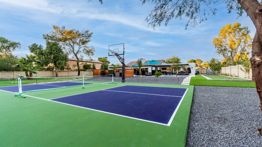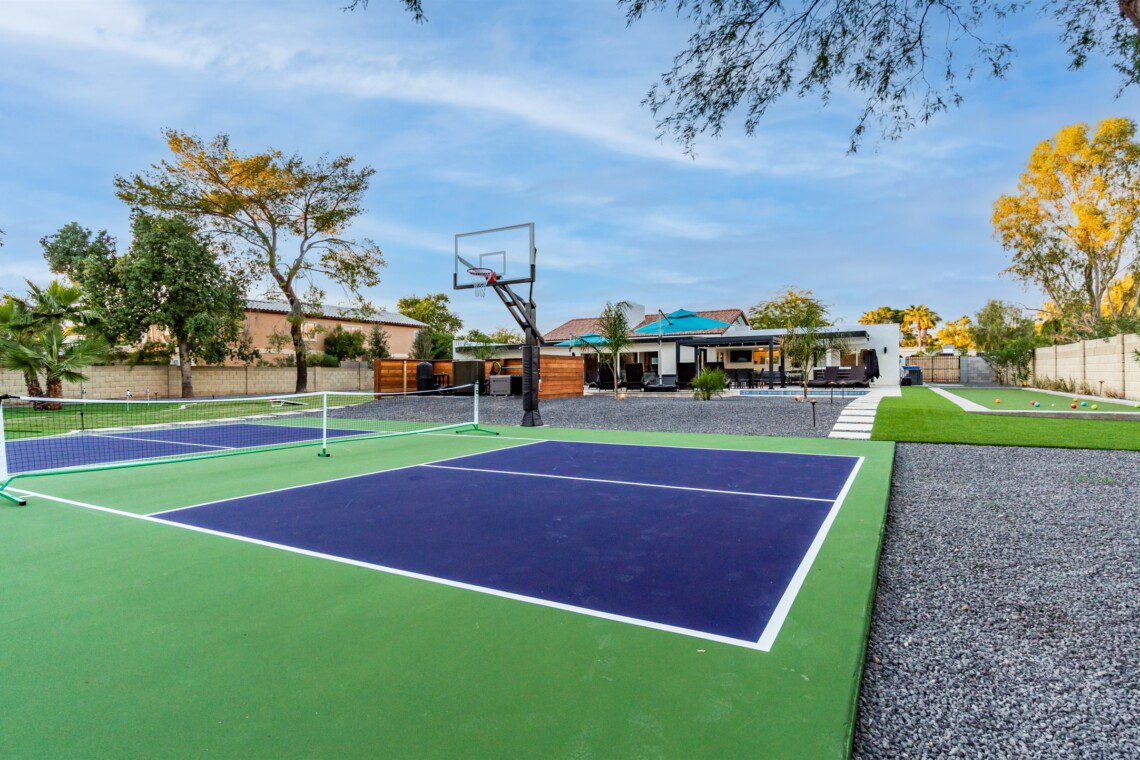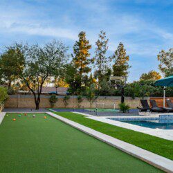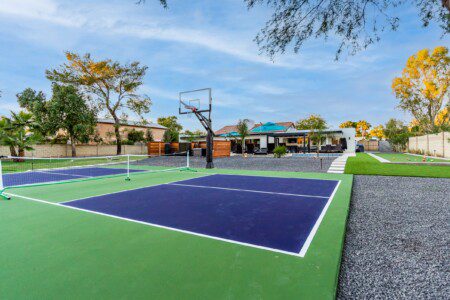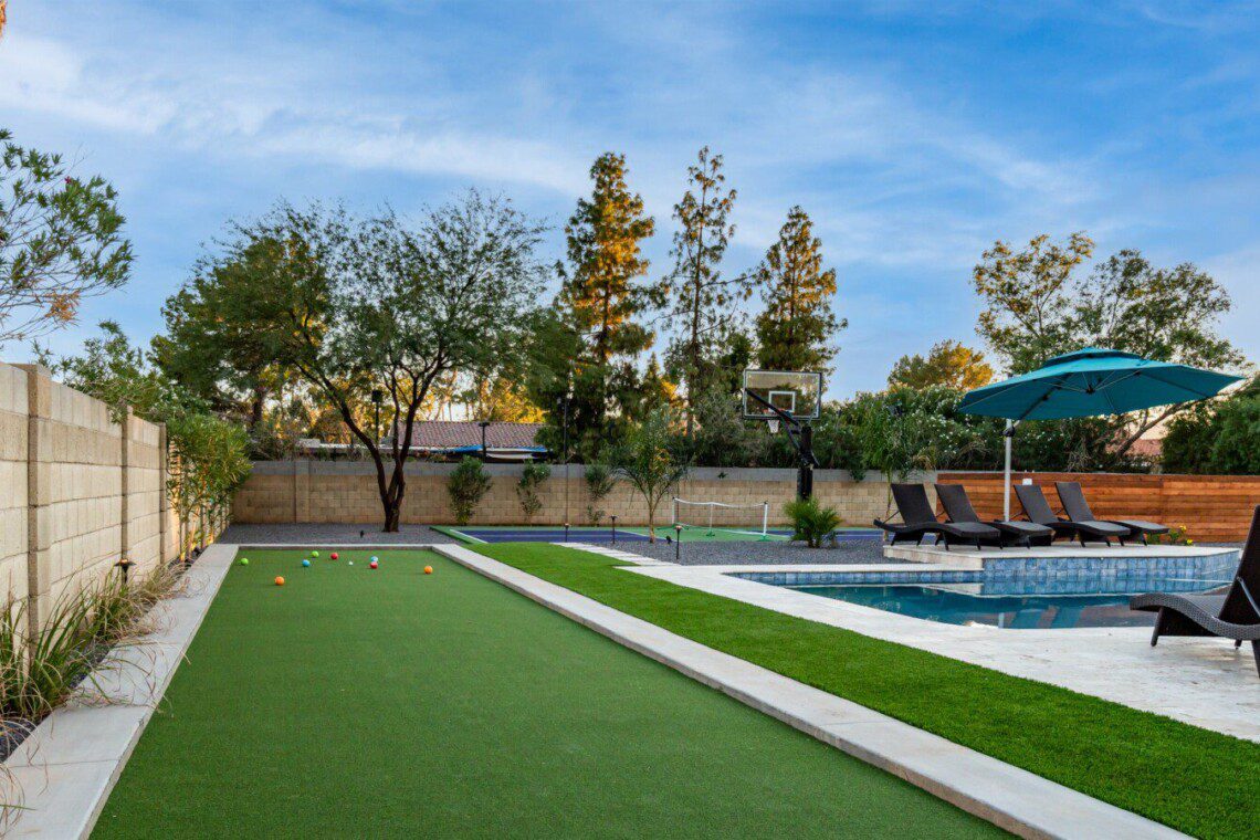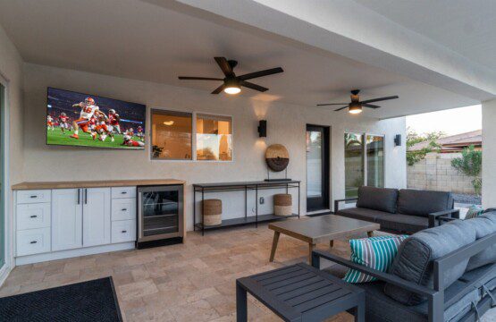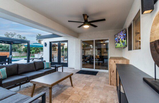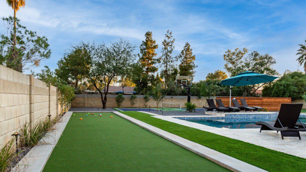 When remodeling this home, meticulous detail was paid into creating an exquisite resort-style backyard. The backyard includes a saltwater pool with room to lounge, a living area (including a TV and an attached mini-bar), a shaded dining area, a fire pit, a pickleball/basketball court, a bocce ball court, and a sizable putting green. These amenities create an exciting environment for those looking for an adventure as well as tranquility for those looking for a desert getaway.