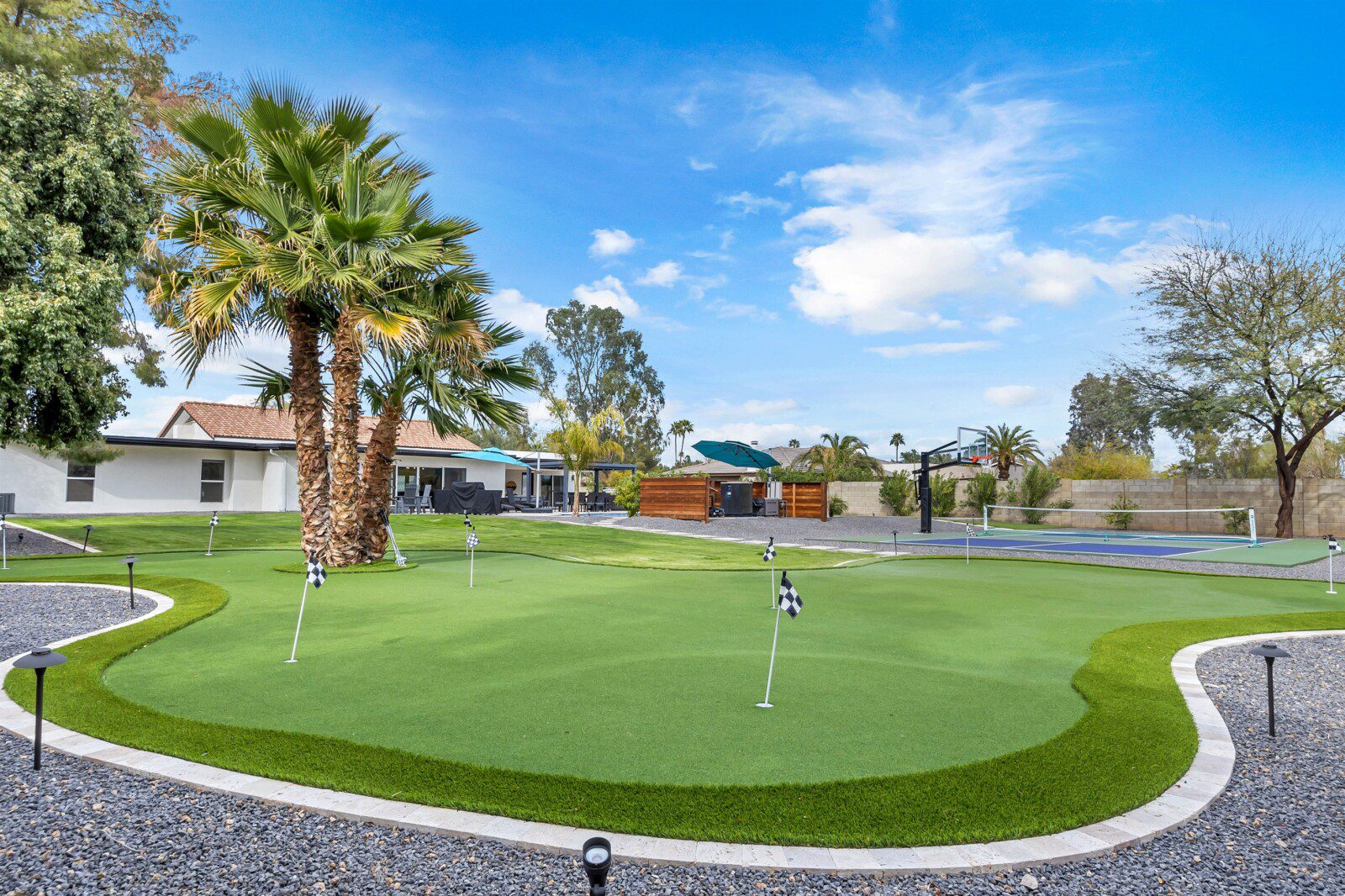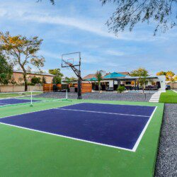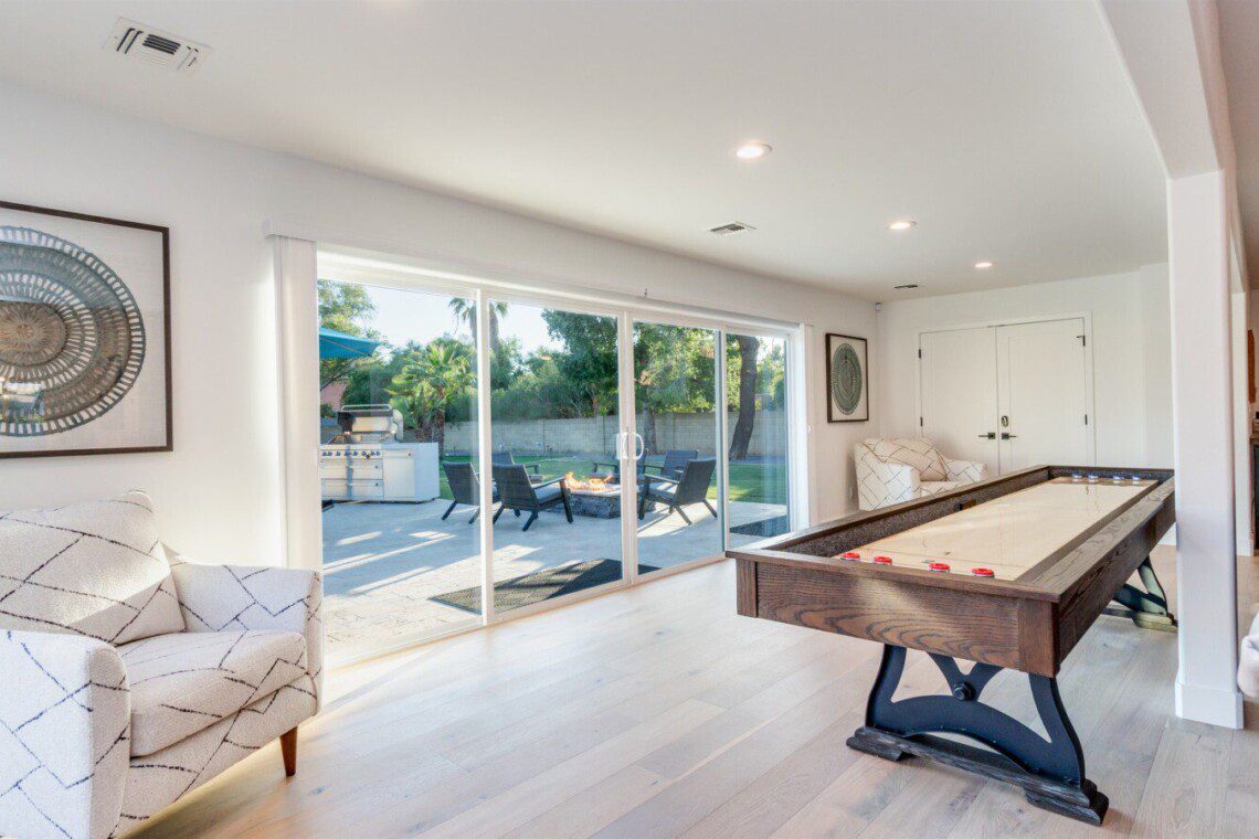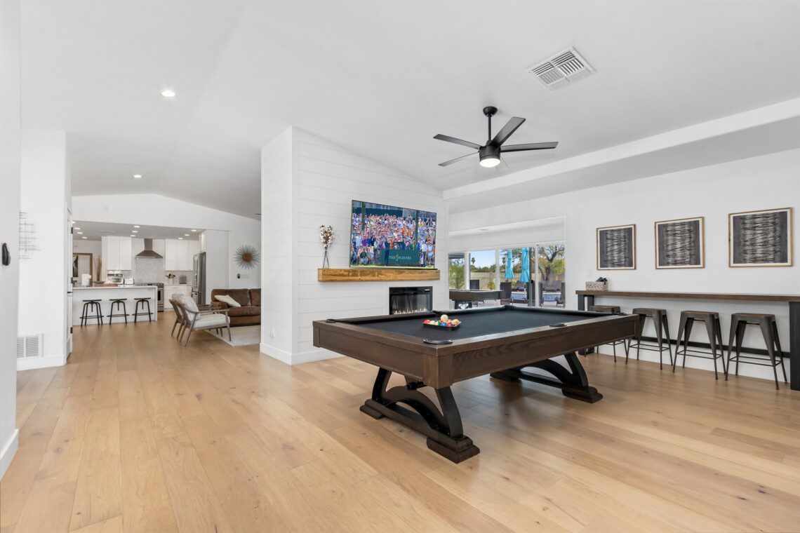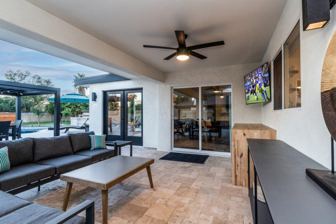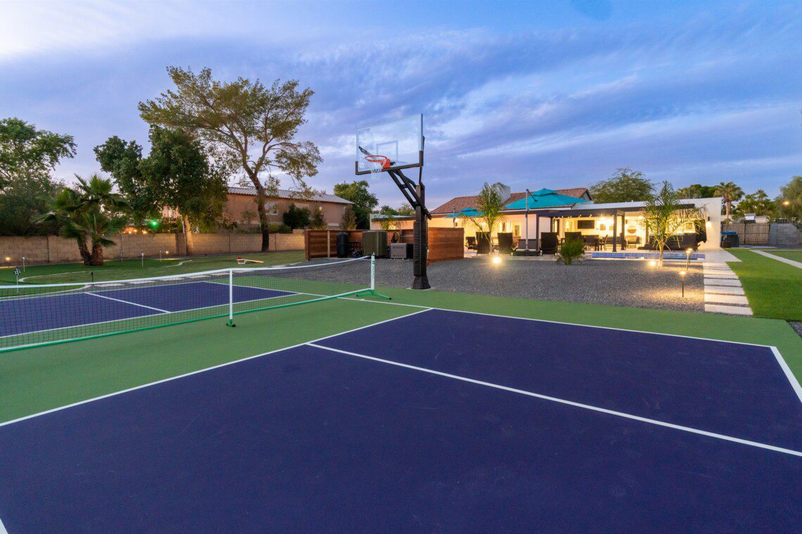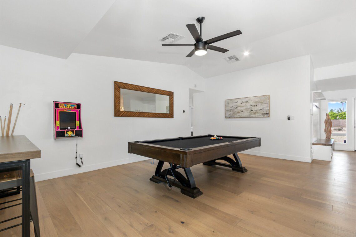 When remodeling this home, meticulous detail was paid into creating an exquisite resort-style backyard. The backyard includes a saltwater pool with room to lounge, a living area (including a TV and an attached mini-bar), a shaded dining area, a fire pit, a pickleball/basketball court, a bocce ball court, and a sizable putting green. These amenities create an exciting environment for those looking for an adventure as well as tranquility for those looking for a desert getaway.