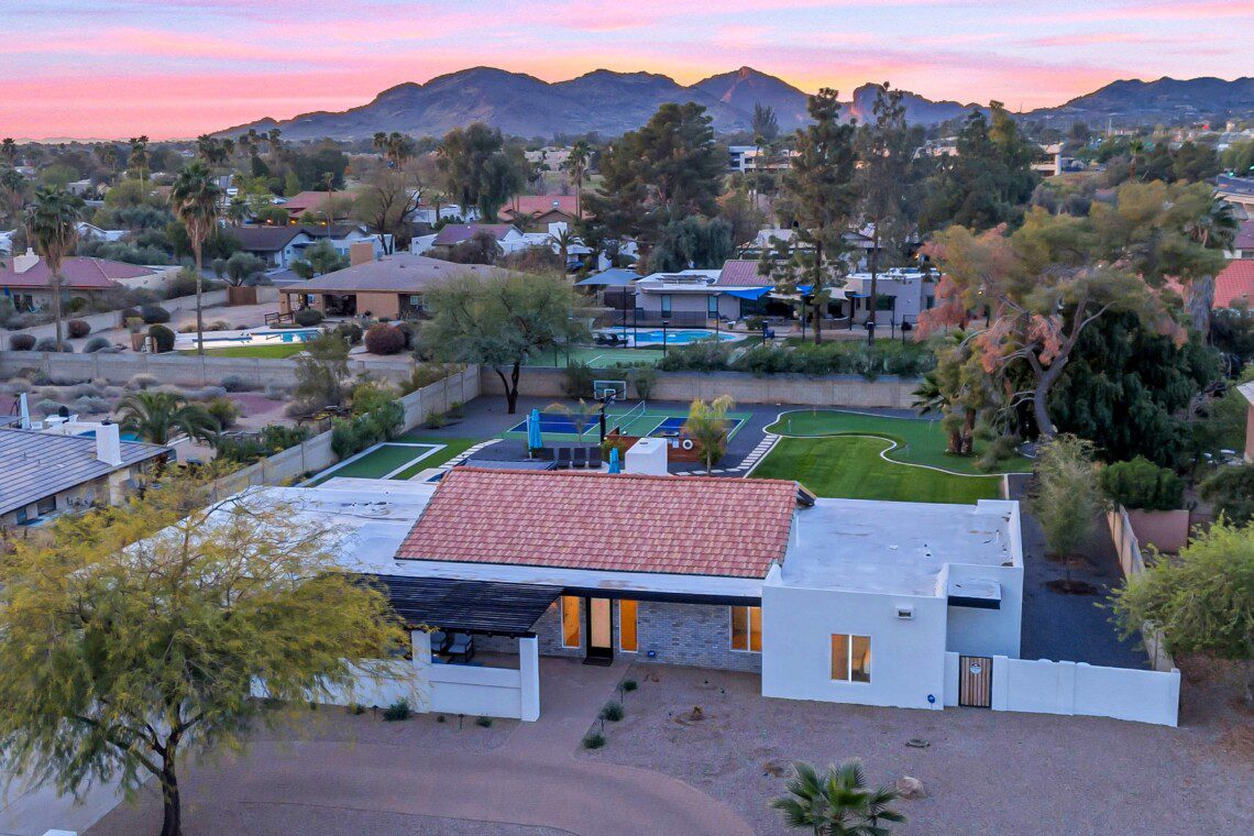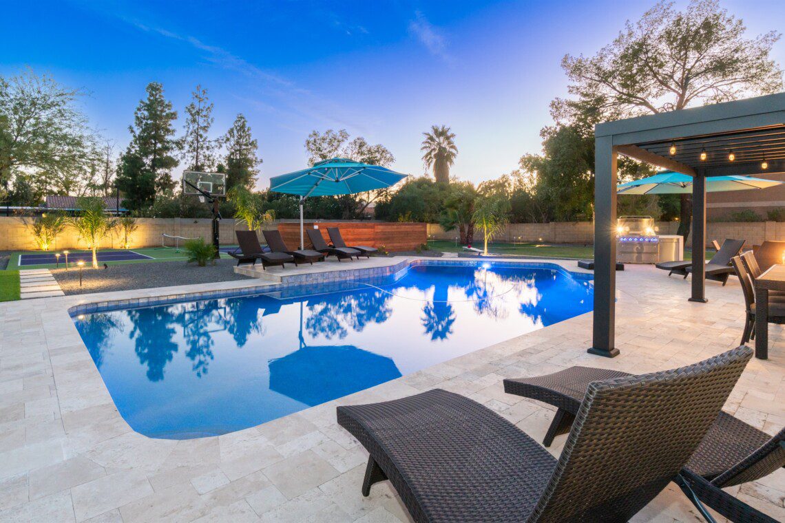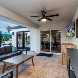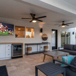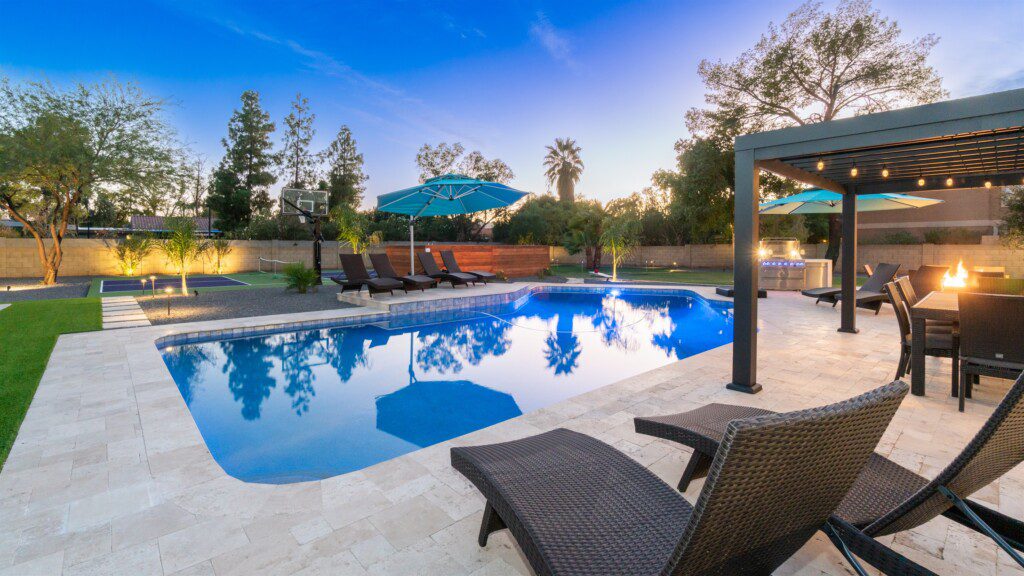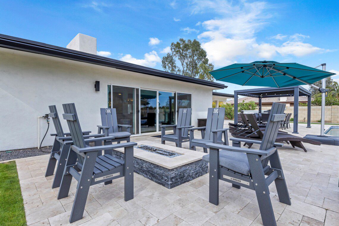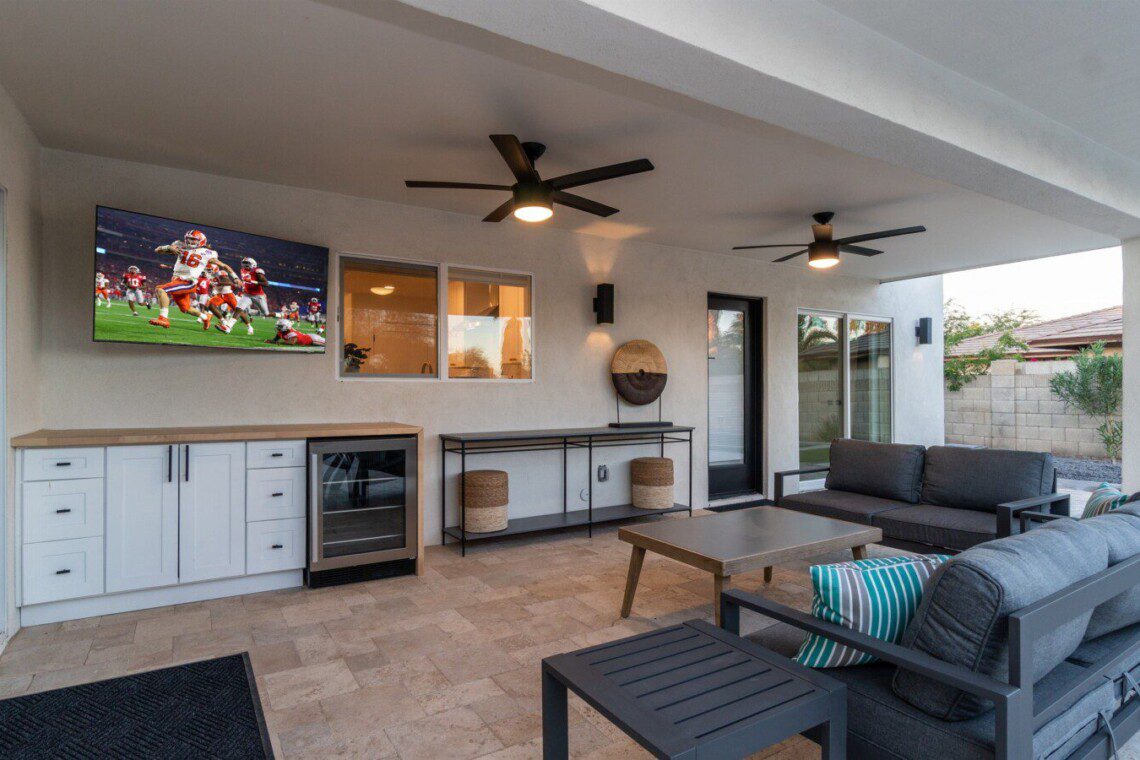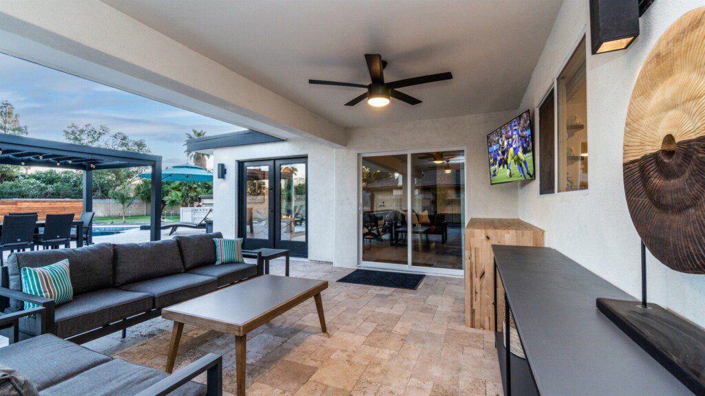 When remodeling this home, meticulous detail was paid into creating an exquisite resort-style backyard. The backyard includes a saltwater pool with room to lounge, a living area (including a TV and an attached mini-bar), a shaded dining area, a fire pit, a pickleball/basketball court, a bocce ball court, and a sizable putting green. These amenities create an exciting environment for those looking for an adventure as well as tranquility for those looking for a desert getaway.