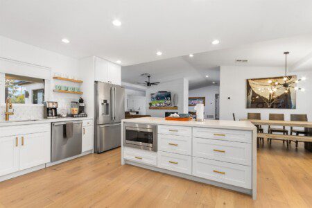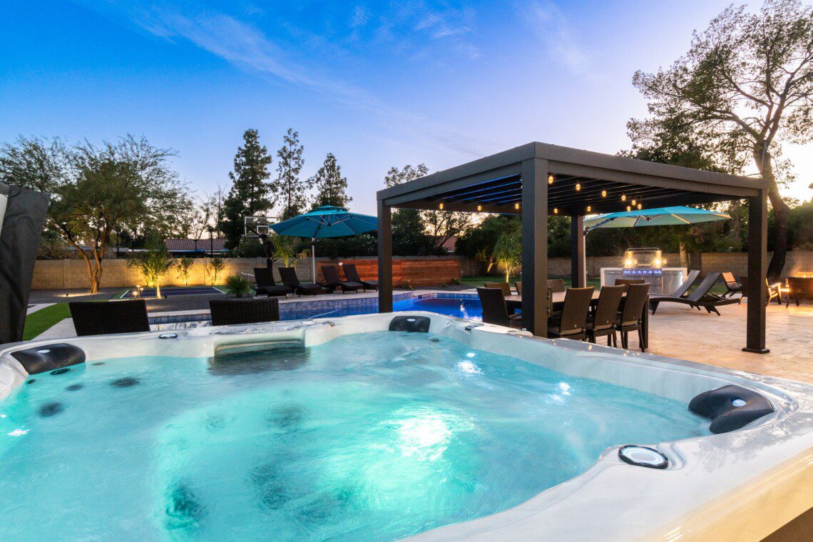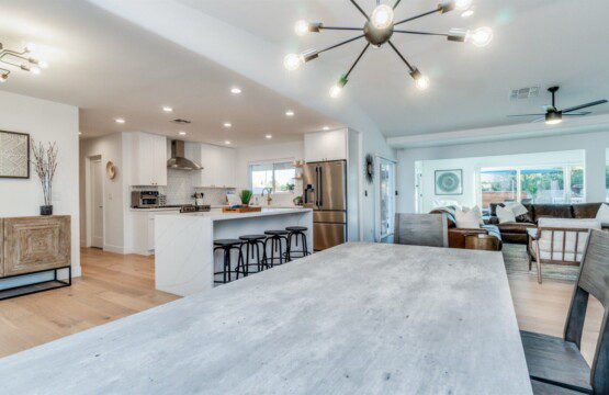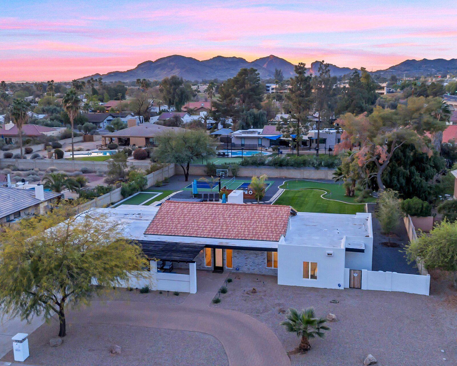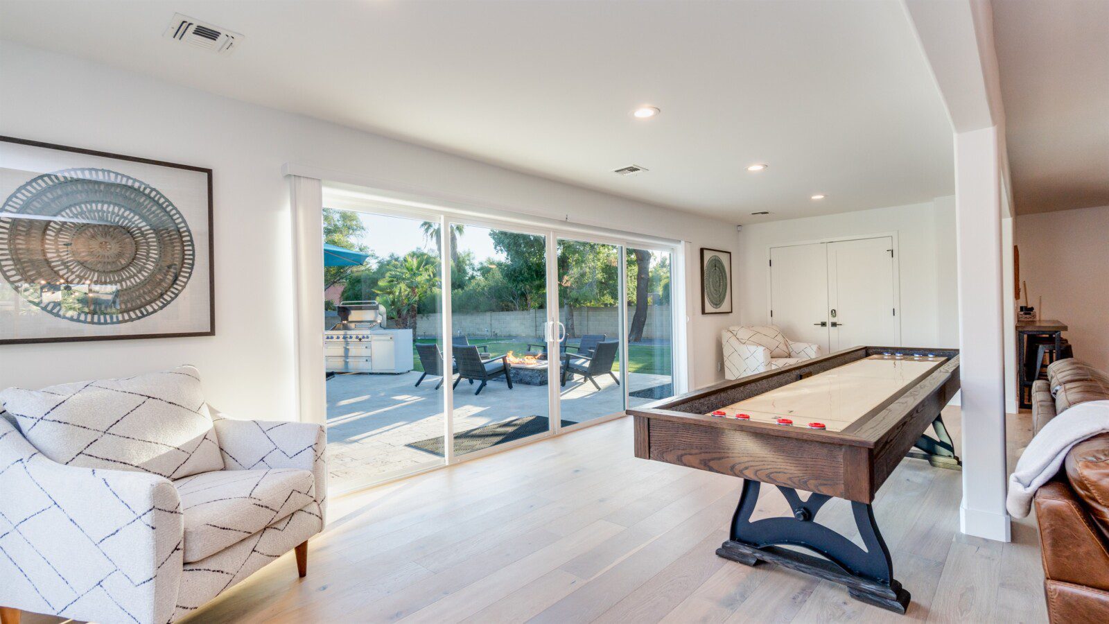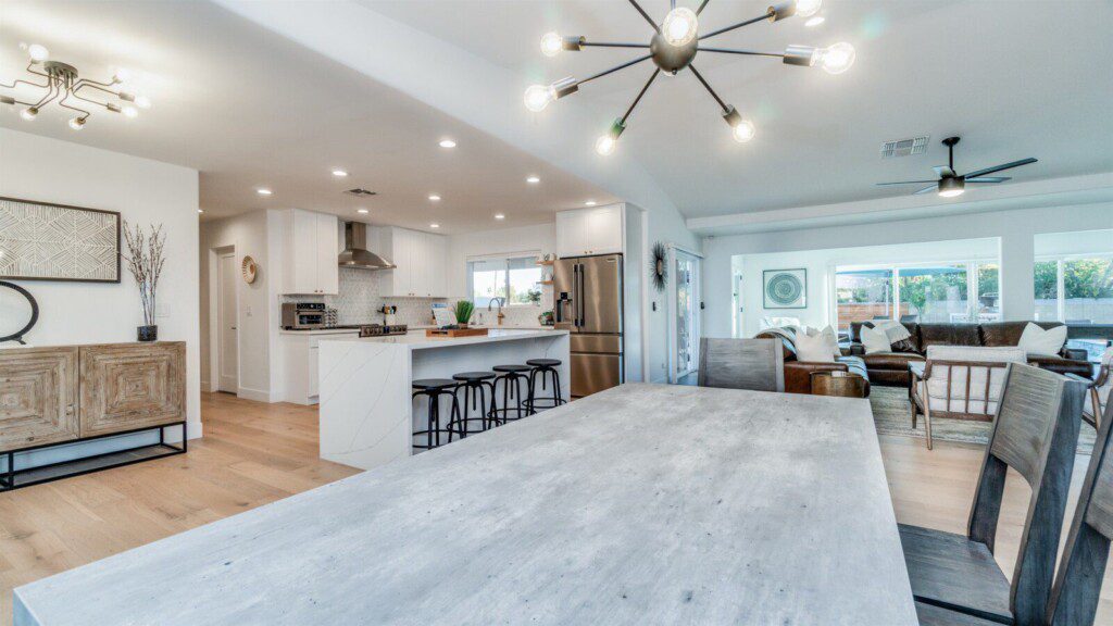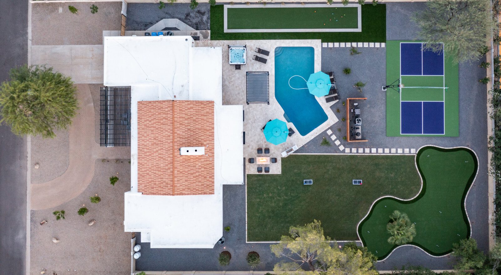 When remodeling this home, meticulous detail was paid into creating an exquisite resort-style backyard. The backyard includes a saltwater pool with room to lounge, a living area (including a TV and an attached mini-bar), a shaded dining area, a fire pit, a pickleball/basketball court, a bocce ball court, and a sizable putting green. These amenities create an exciting environment for those looking for an adventure as well as tranquility for those looking for a desert getaway.