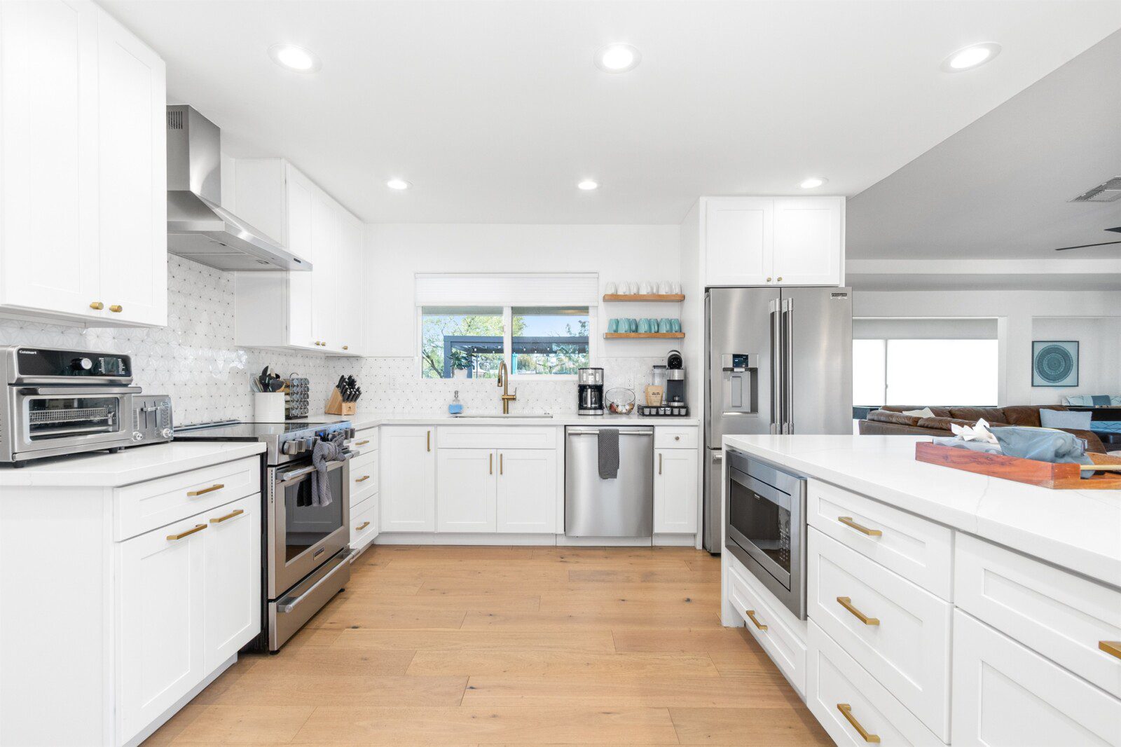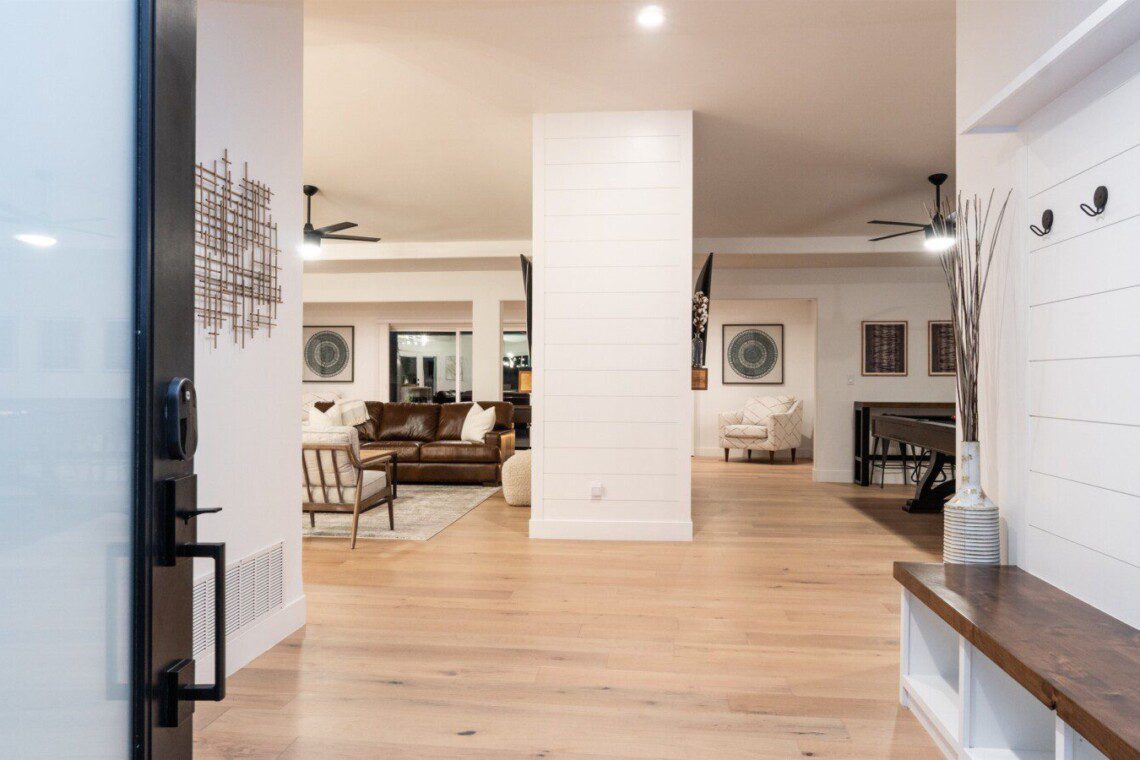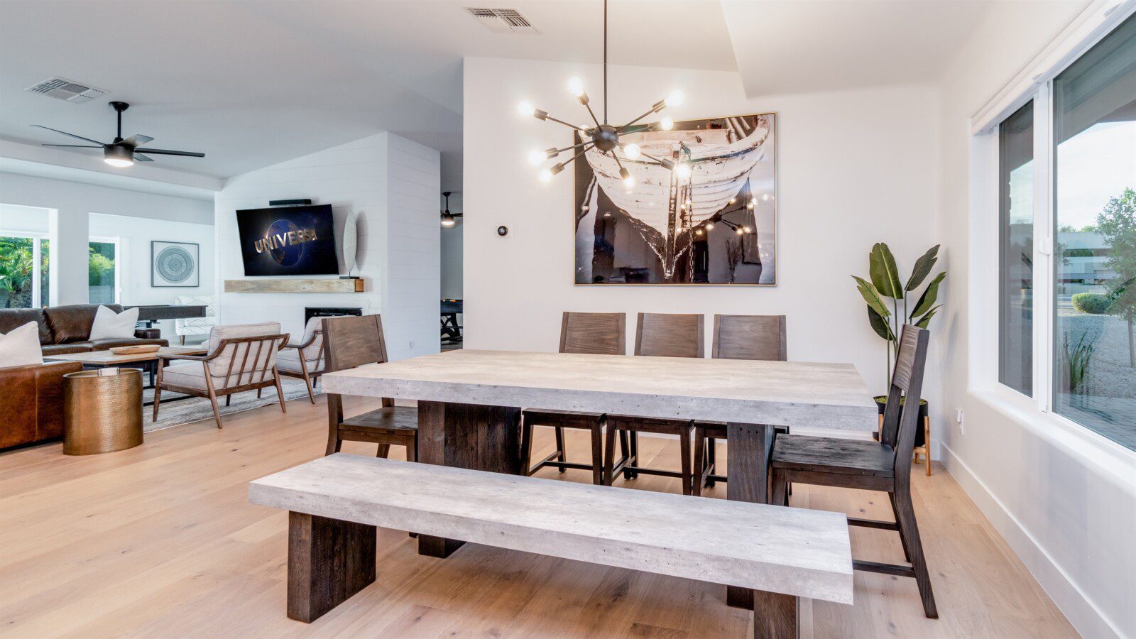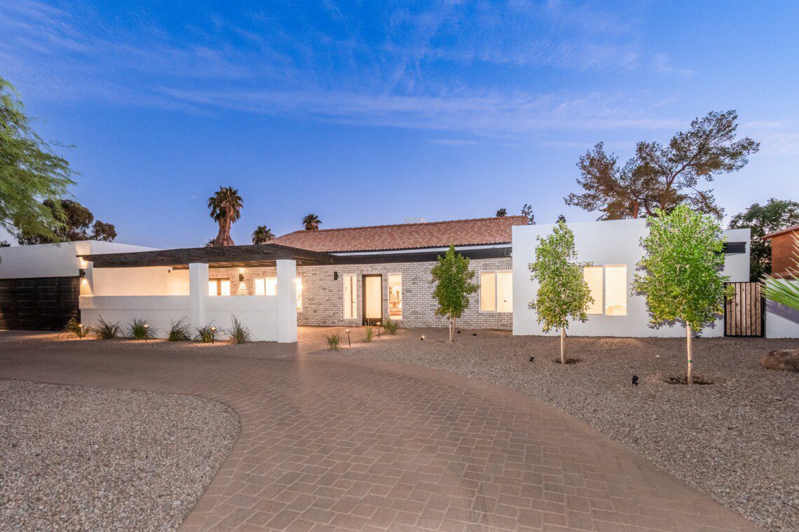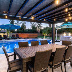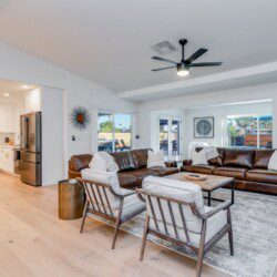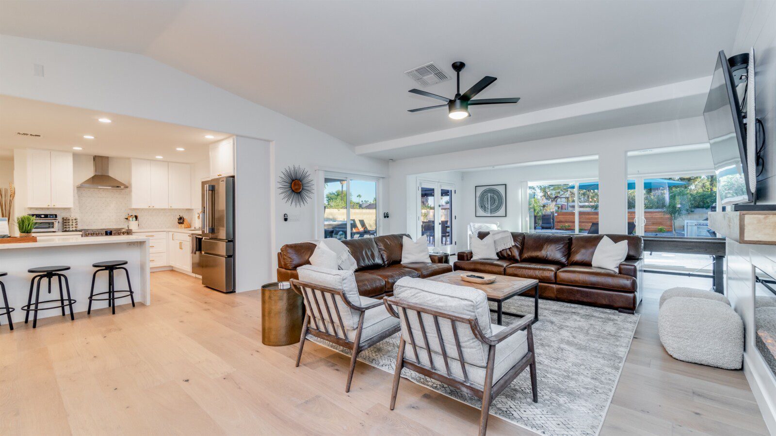 When remodeling this home, meticulous detail was paid into creating an exquisite resort-style backyard. The backyard includes a saltwater pool with room to lounge, a living area (including a TV and an attached mini-bar), a shaded dining area, a fire pit, a pickleball/basketball court, a bocce ball court, and a sizable putting green. These amenities create an exciting environment for those looking for an adventure as well as tranquility for those looking for a desert getaway.