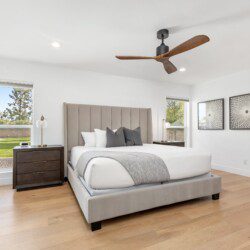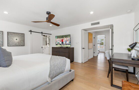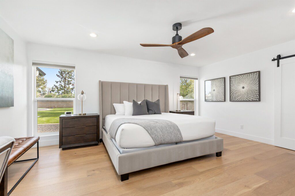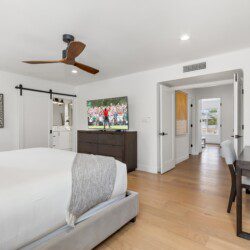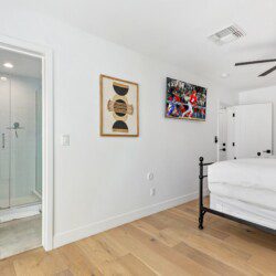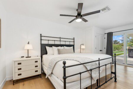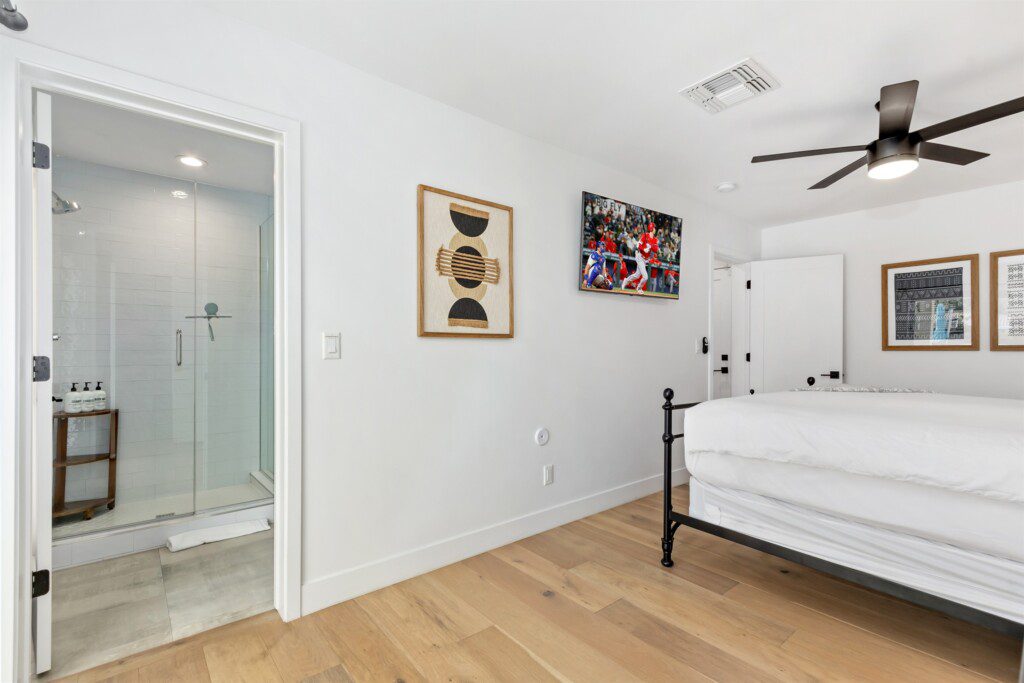 Jr Master with king bed, ensuite bathroom, and access to the backyard